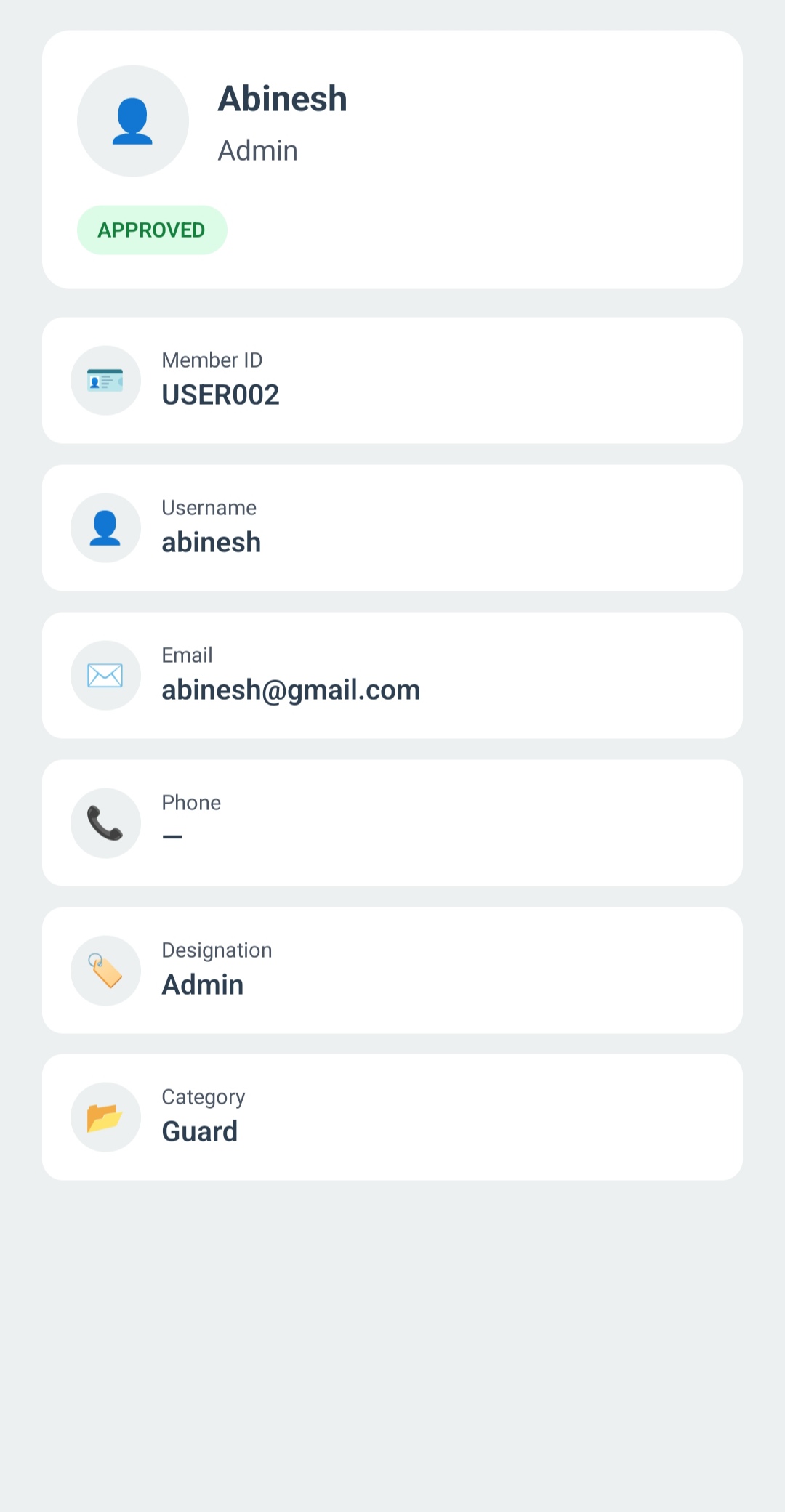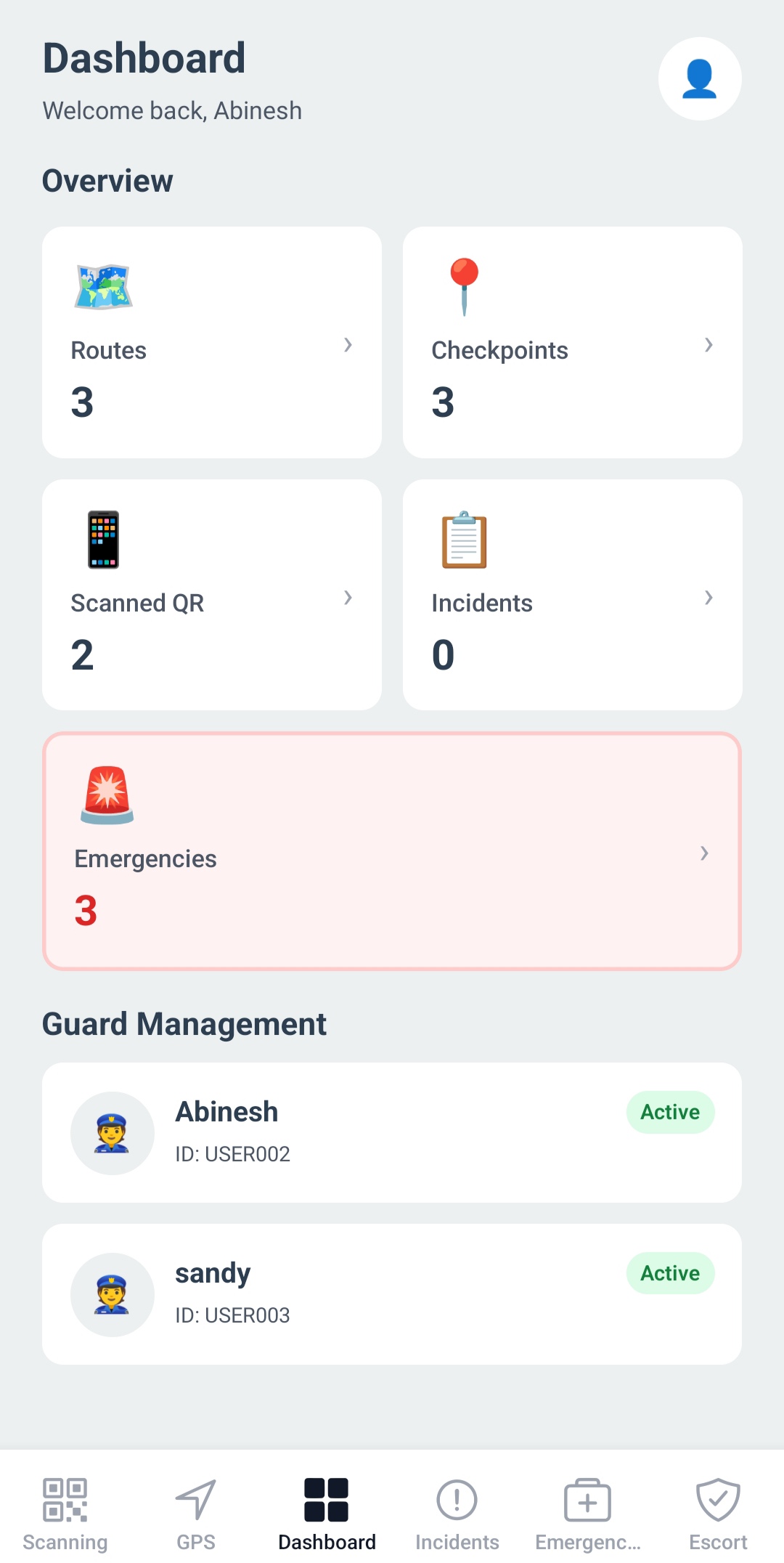 - • Quick Actions: add new guard, view guards, assign patrols, performance reports.
